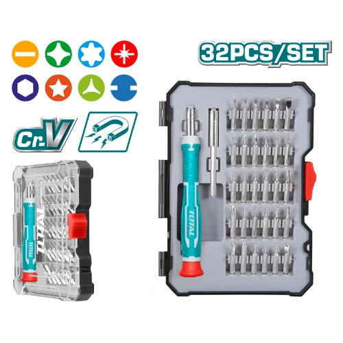 ست 34 عددی سری بیت توتال مدل TACSD30326، مجموعهای کاربردی از سریهای پیچ گوشتی دوسو، سریهای پیچ گوشتی چهارسو، سریهای پیچ گوشتی ستارهای، سریهای پیچ گوشتی چهارسو خاردارو سریهای آلنی میباشد. تمام قطعات فلزی این مجموعه 34 عددی از آلیاژ کروم وانادیوم ساخته شدهاند و از مقاومت فوقالعاده بالایی برخوردار هستند. دسته این ست سری بکس و پیچ گوشتی، با طراحی حرفهای توتال ساخته شده است. این مجموعه 34 عددی در یک جعبه پلاستیکی مقاوم با درب شفاف به بازار ابزار ایران عرضه میشود.