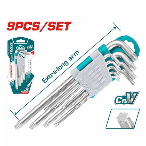 آچار آلن، ابزاری است که از آن در تعمیر خودرو و ماشینآلات صنعتی استفاده میشود. توتال انواع آچار آلن را به صورت تکی و مجموعه، با مشخصات متنوع وارد بازار ابزار ایران و جهان میکند. آلن ست 9 عددی ستارهای تمام بلند توتال مجموعهای از 8 عدد آچار آلن است. طراحی دقیق و نوک صاف این مجموعه آچار، موجب حداکثر گیرایی و تماس با پیچ میشود.